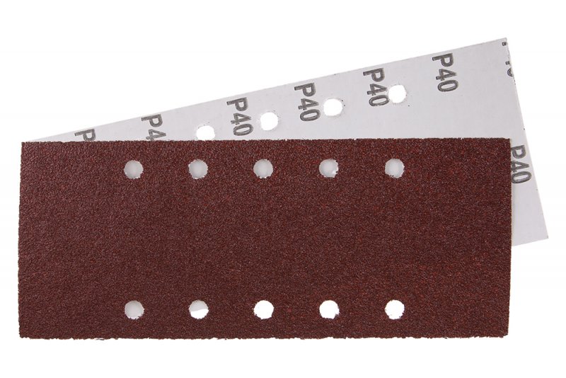 Brusný papír - sada 5kusů, zrnitost: 40, typ : 10 otvorů, druh zrna: oxid hlinitý, pojivo: syntetická pryskyřice, podkladový materiál: pružný papír C (110-135g/m2), rozměry : uvedeny v názvu výrobku, balení : blistr s papírovou kartou s eurootvorem.