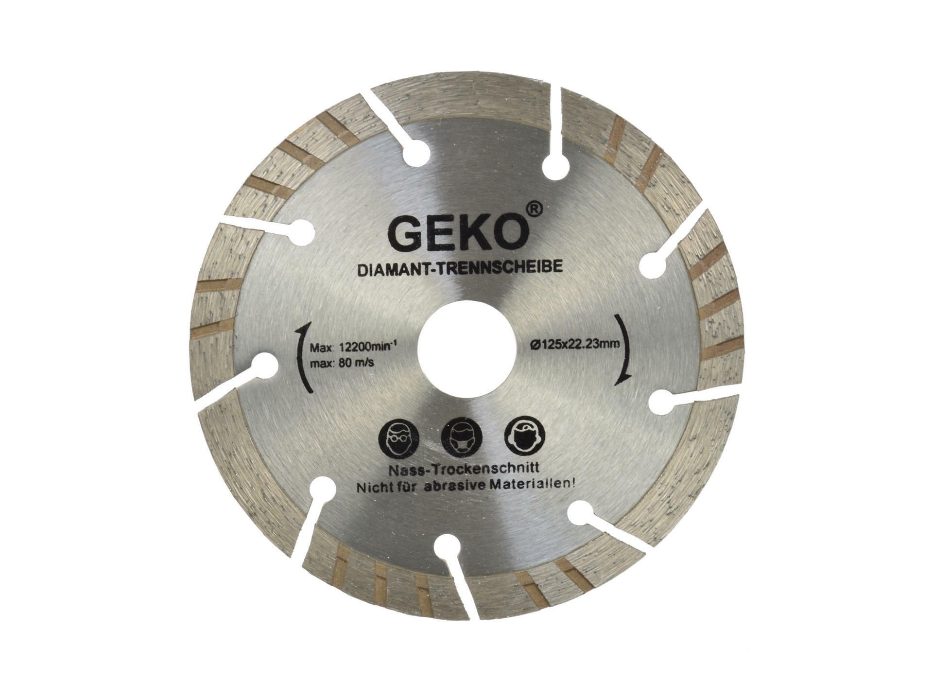 Precizní diamantový řezný turbo-segmentový kotouč GEKO s přerušovaným diamantovým segmentem (s drážkami, výřezy), který je rozdělený na určitý počet užších segmentů a prolamováním po celém obvodu. Díky segmentům a prolamování tento kotouč chladí lépe jak ostatní kotouče, lépe vynáší obroušený materiál z řezu ven a řezání je rychlejší, avšak může docházet ke štípání hran a výsledný řez je širší. Turbo-segmentový kotouč se hodí pro hluboké řezání tvrdých stavebních materiálů jako je např. beton, železobeton, asfalt, zdivo, kámen, zámkový dlažba apod. S turbo-segmentovým kotoučem je možné řezat za mokra i za sucha.