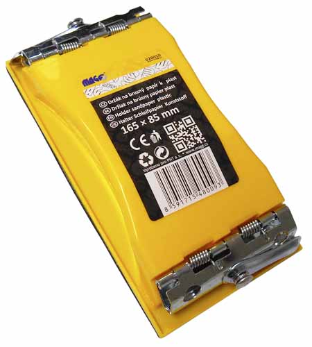 Plastový úchyt – držák na brusný papír MAGG 020010 Rozměry pracovní plochy: 165 x 85 mm Určeno k upevnění smirkového papíru pro pohodlné a kvalitní broušení. Papír se přichytává pomocí pružinových klipsen, pracovní plocha má gumovou vrstvu. Může být v různém barevném provedení.