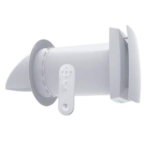 INSTALACE:Do nejlépe do jádrovým vrtáním vyvrtaného otvoru se vsune venkovní část potrubí s hlavicí se silikonovým límcem tak, aby celý límec prošel otvorem a pohybem zpět se opřel o venkovní fasádu. Poté se venkovní díl vystředí a zajistí PU montážní pěnou. Po zatuhnutí se vloží část s tepelným výměníkem a filtry a opět upevní PU pěnou. Nakonec se upevní vnitřní jednotka na vnitřní stěnu a připojí se k el. síti.