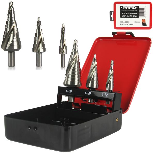 Sada 3 stupňovitých vrtáků se spirálou 4-12; 4-20; 6-30mm RAPID