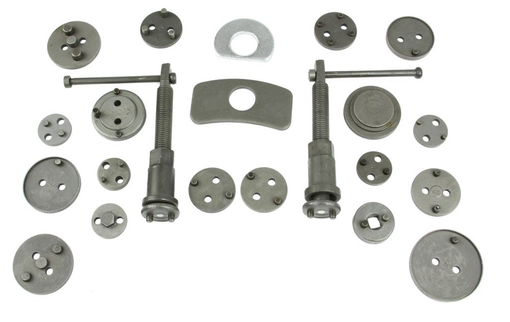 Univerzální sada v plastovém kufru slouží pro montáž/zpětné vracení pístů/třmenů kotoučových brzd a obsahuje šroubový přípravek a 17 adaptérů.