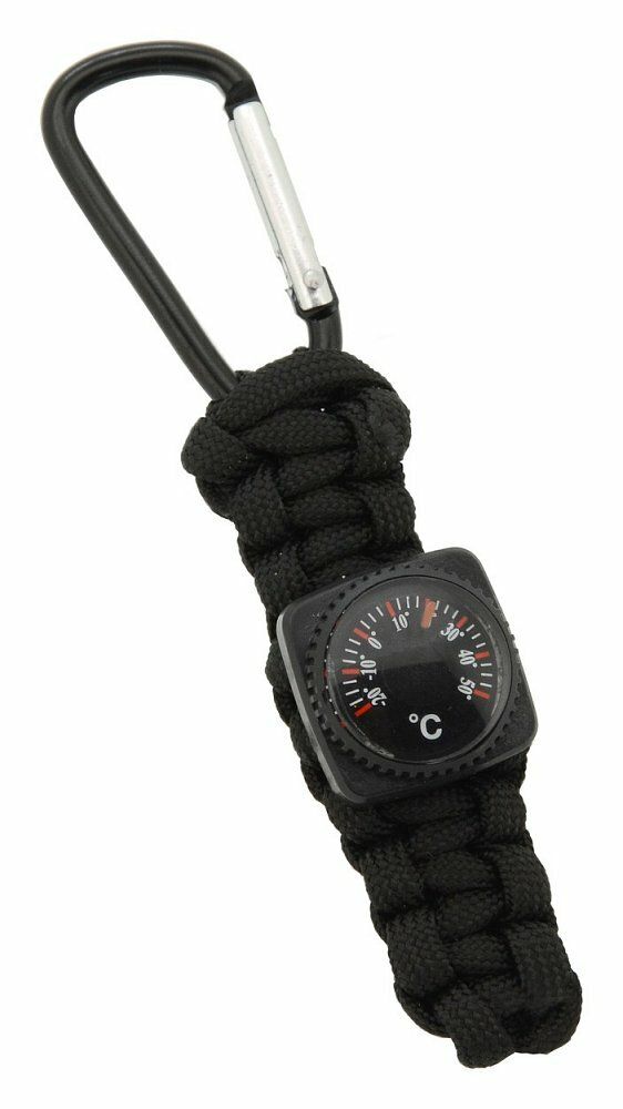 Outdoorový přívěšek s teploměrem pro zavěšení za karabinku. Přívěšek je pletený z paracordu ve vzoru kobra, který je možné v nouzovém případě kompletně rozplést a použít jako provaz. Celková délka tohoto doplňku je cca 11 cm i s karabinkou. Jedná se o užitečný doplněk do přírody, který nezabírá téměř žádné místo.