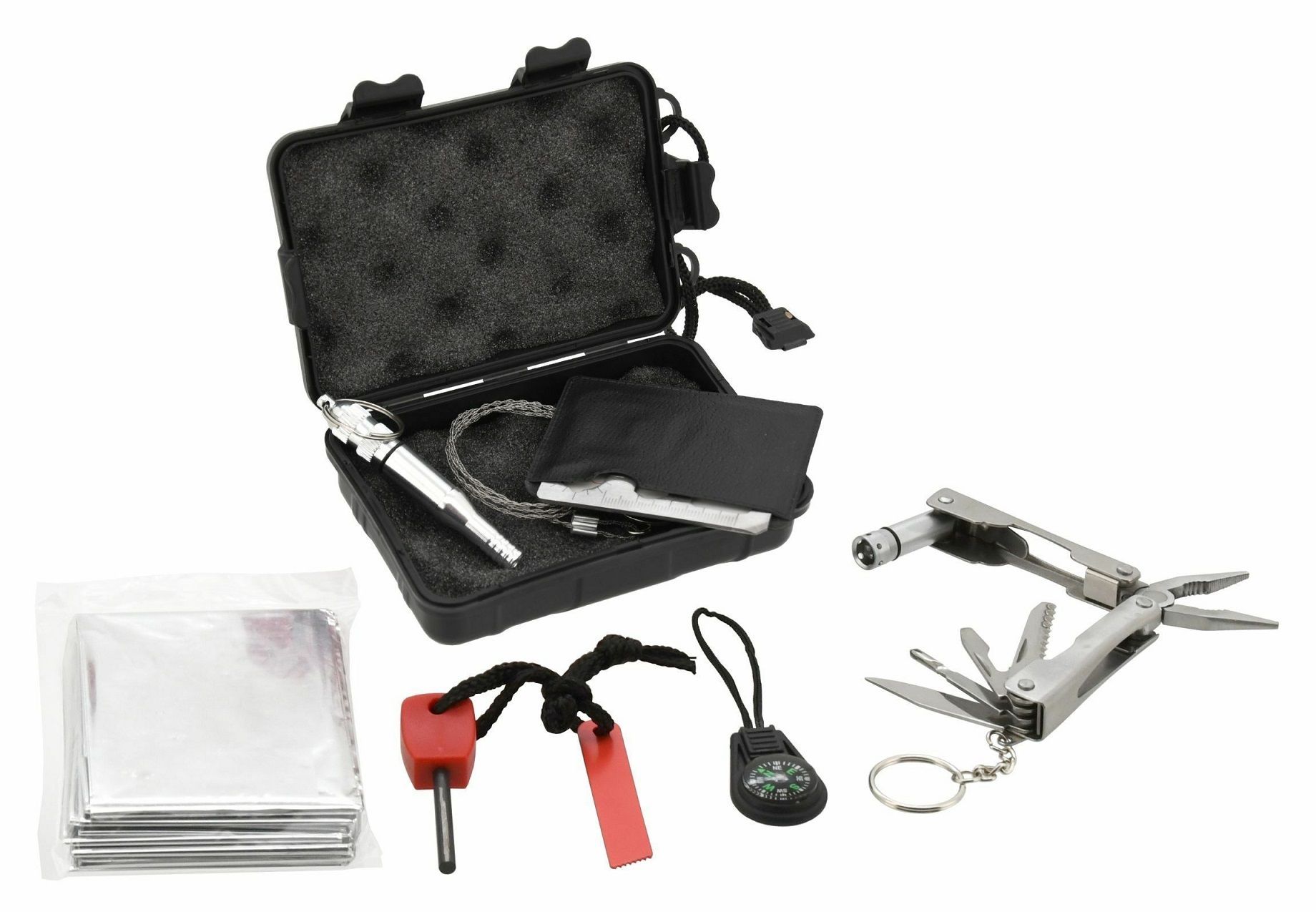 Sada plnící řadu funkcí, užitečných v krizových situacích. SOS sadu lze využít jako záchranný nástroj, nebo jako doplněk pro Outdoor aktivity a Camping. SOS sada je složena z řezné struny pro řezání dříví, kartového multifunkčního nástroje, multitool kleští s LED svítilnou, kompasu, bivakovací (izotermické) fólie, křesadla pro zapálení ohně a nakonec píšťalky. Vše je uloženo v ochranném, uzavíratelném pouzdře.