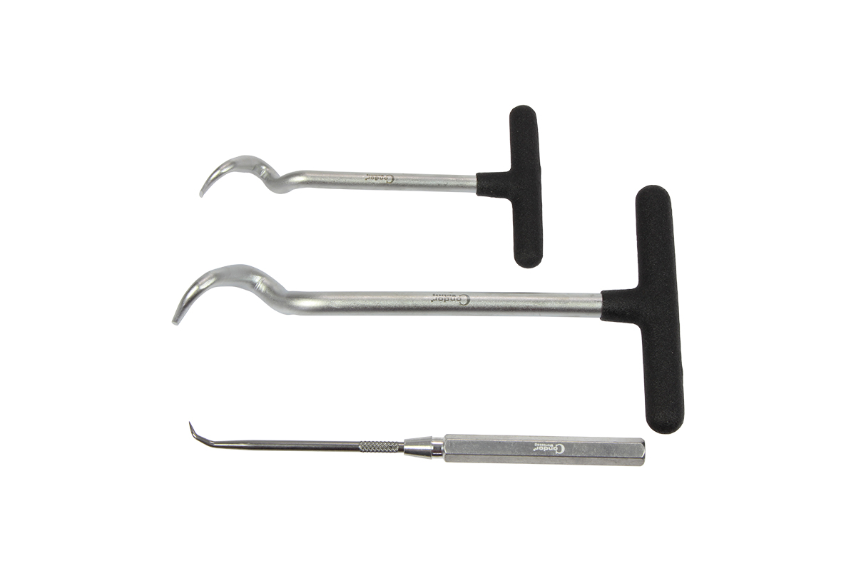 Háky jsou určeny k demontáži guferových těsnění a O - kroužků *2 háky s "T" rukojetí mají esovitý tvar pro lepší zachycení těsnění *1 háček je uzpůsoben tvarem k jemnějšímu zachycení kroužků *sada 3 díly