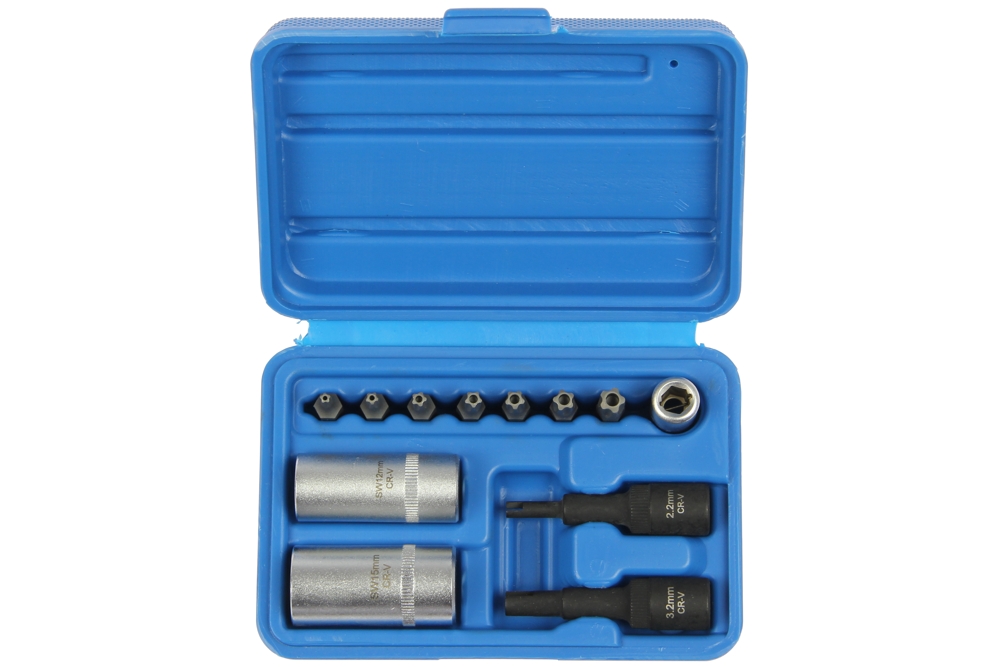 Sada je určená na výmenu ventilov na potrubí klimatizácie *pre VW - Audi - Opel atď. *špeciálna nástrčka 2,2 mm - 1/4" vstup - dĺžka 40 mm *špeciálna nástrčka 3,2 mm - 1/4 " vstup - dĺžka 40 mm *špeciálna nástrčka 12 mm - 1/4 " vstup - dĺžka 50 mm *špeciálna nástrčka 15 mm - 1/4 " vstup - dĺžka 50 mm *bit TS10 - 1/4 " vstup - dĺžka 25 mm *bit TS15 - 1/4 " vstup - dĺžka 25 mm *bit TS20 - 1/4 " vstup - dĺžka 25 mm *bit TS25 - 1/4 " vstup - dĺžka 25 mm *bit TS27 - 1/4 " vstup - dĺžka 25 mm *bit TS30 - 1/4 " vstup - dĺžka 25 mm *bit TS40 - 1/4 " vstup - dĺžka 25 mm *adaptér pre 1/4" bity