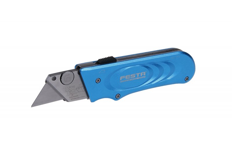 Profesionální celokovový nůž, výsuvná lichoběžníková čepel s aretačním tlačítkem, klip na opasek, 5 náhradních čepelí.