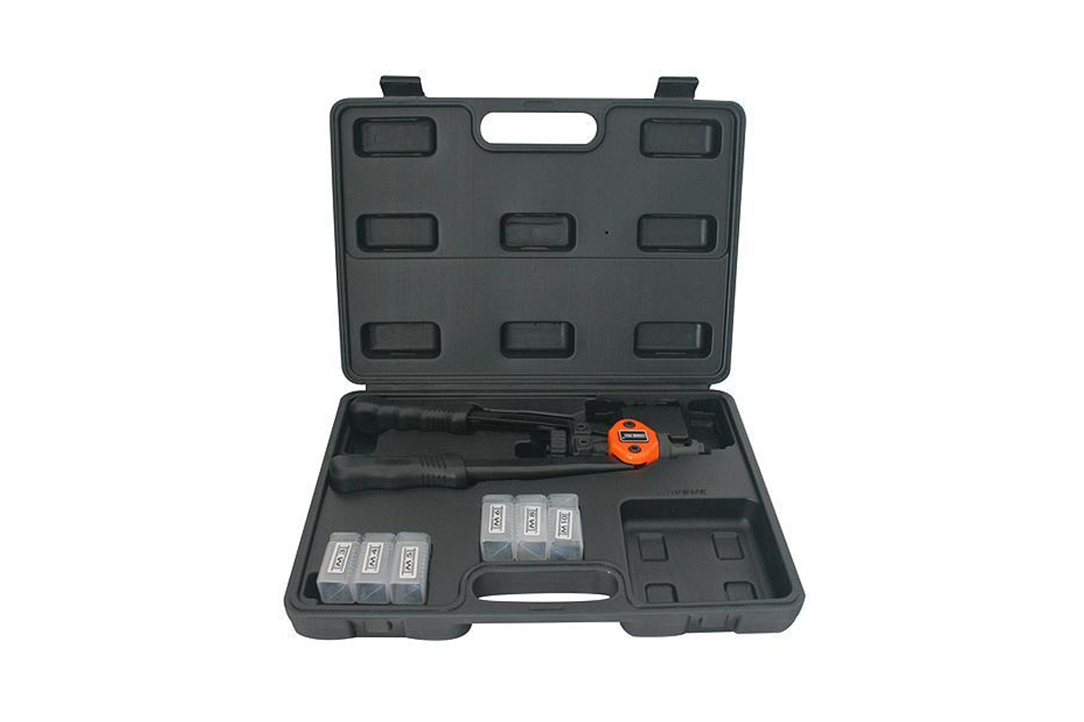 Kleště nýtovací na maticové nýty jsou určeny k usazování nýtovacích matic za účelem spojování plechů apod. Pomocí nýtovací matice v zanýtovaném spoji vytvoříte neporušený závit, na který můžete snadno připevňovat další komponenty. Čelisti jsou vyrobeny z legované Chrom - Molybdenové oceli. Rukojeti jsou opatřeny protiskluzovou gumovou vrstvou. Nýtovací kleště spolu s hlavami a nýtovacími maticemi jsou uloženy v praktickém plastovém kufříku.*nástavce pro ALU, ocelové i nerezové nýty M3 - M4 - M5 - M6 - M8 - M10 *pákové *délka 330 mm