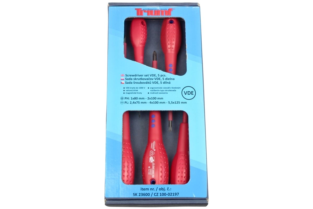 Čepele skrutkovačov sú vyrobené z vysoko kvalitnej legovanej chróm-vanádiovej ocele. Ergonomické rukoväte sú z jedného kusu a sú vstrekované priamo na drieku pre vysokú odolnosť a pevnosť , mäkčený povrch v protišmykovom vyhotovení pre pohodlné uchopenie. * Plochý skrutkovač PL4 x 80 mm - PL5,5 x 125 mm - PL6,5 x 150 mm * Krížový skrutkovač PH1 x 80 mm - PH2 x 100 mm * Skrutkovače sú testované proti úrazu elektrickým prúdom podľa normy DIN EN 60900
