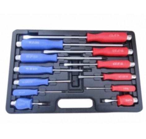 Sada 12 kusov. Skrutkovače sú farebne označené podľa typu - červené (ploché) a modré (krížové).