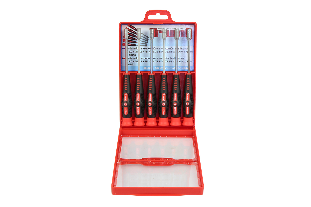 Šroubováky na jemnou mechaniku pro hodináře na opravu hodinek, pro elektroniky na opravy mobilních telefonů, PC, notebooků aj. Tento typ šroubováku nesmí chybět v žádné řemeslné a hobby dílně. Dříky šroubováků jsou vyrobeny z jakostní legované Chrom – Vanadiové oceli. Rukojeť je dvoukomponentní s otočnou hlavou pro pohodlnou práci. Pro lepší přehlednost a skladovatelnost jsou šroubováky uloženy v plastové krabičce. *délka dříků 75 mm *sada obsahuje: *šroubovák s nástrčným 6ti hranem 3 - 3,5 - 4 - 5 - 5,5 - 6 mm