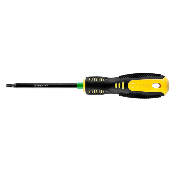 Šroubovák Torx T20 x 100 mm, kalený hrot, magnetické zakončení, CrV ocel, rukojeť z bi-materiálu Šroubovák Torx TOPEX, velmi užitečný při mechanických pracích a při domácím kutilství. Dřík vyroben z vysoce odolné chrom-vanadiové oceli zaručující dlouhodobou životnost nářadí. Magnetický hrot z kalené oceli usnadňuje práci s nářadím. Ergonomická plastová rukojeť potažena protiskluzovým materiálem poskytuje pohodlí a bezpečnost při práci. Značka TOPEX je určena pro domácí kutily.