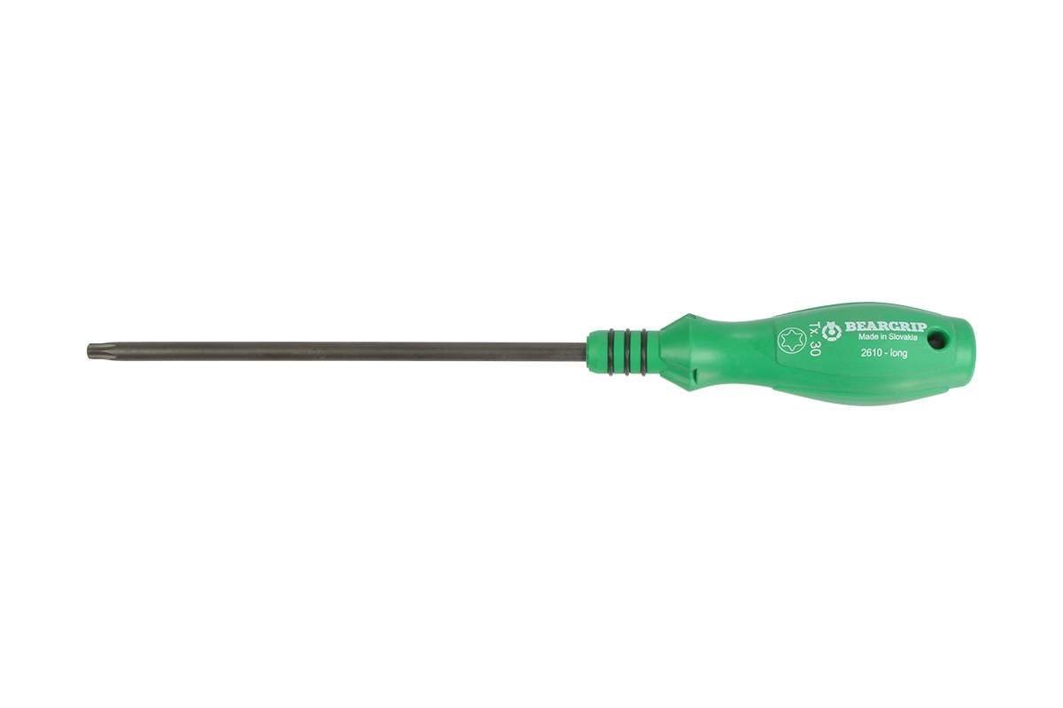 Dřík šroubováku je vyroben z jakostní legované oceli 61CrVSiV5 a kalen na tvrdost 54 - 56 HRc. Ergonomická rukojeť je jednokomponentní a je vstřikována přímo na dřík pro vysokou odolnost a pevnost.*dřík z chrom-vanadiové oceli, kalený, černěný *rukojeť s otvorem pro zavěšení *tvar hrotu Torx*velikost hrotu T40 *délka dříku 170 mm