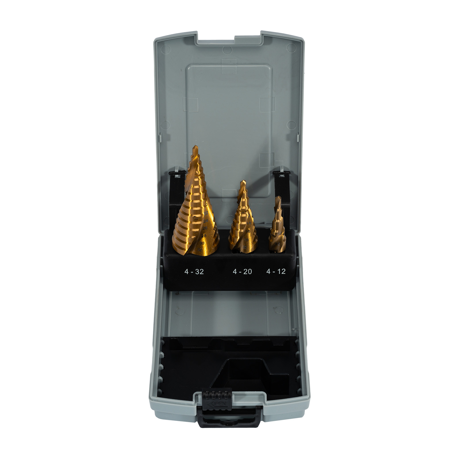 Sada stupňovitých vrtáků slouží pro vyvrtání kruhových otvorů v ocelových plátech (i měkčí materiály jako dřevo, plast...).Plynulé a bezhrotové vrtání bez deformace materiálu. Díky titanovému povrchu je vrták mnohem odolnější, použitelný téměř ve všech aplikacích.Výhodou TiN je dobrá elasticita a adheze, snižuje energetickou náročnost obrábění, chrání nástroj proti opotřebení na čele i hřbetu nástroje.Vhodné pro aku/elektrické vrtačky.