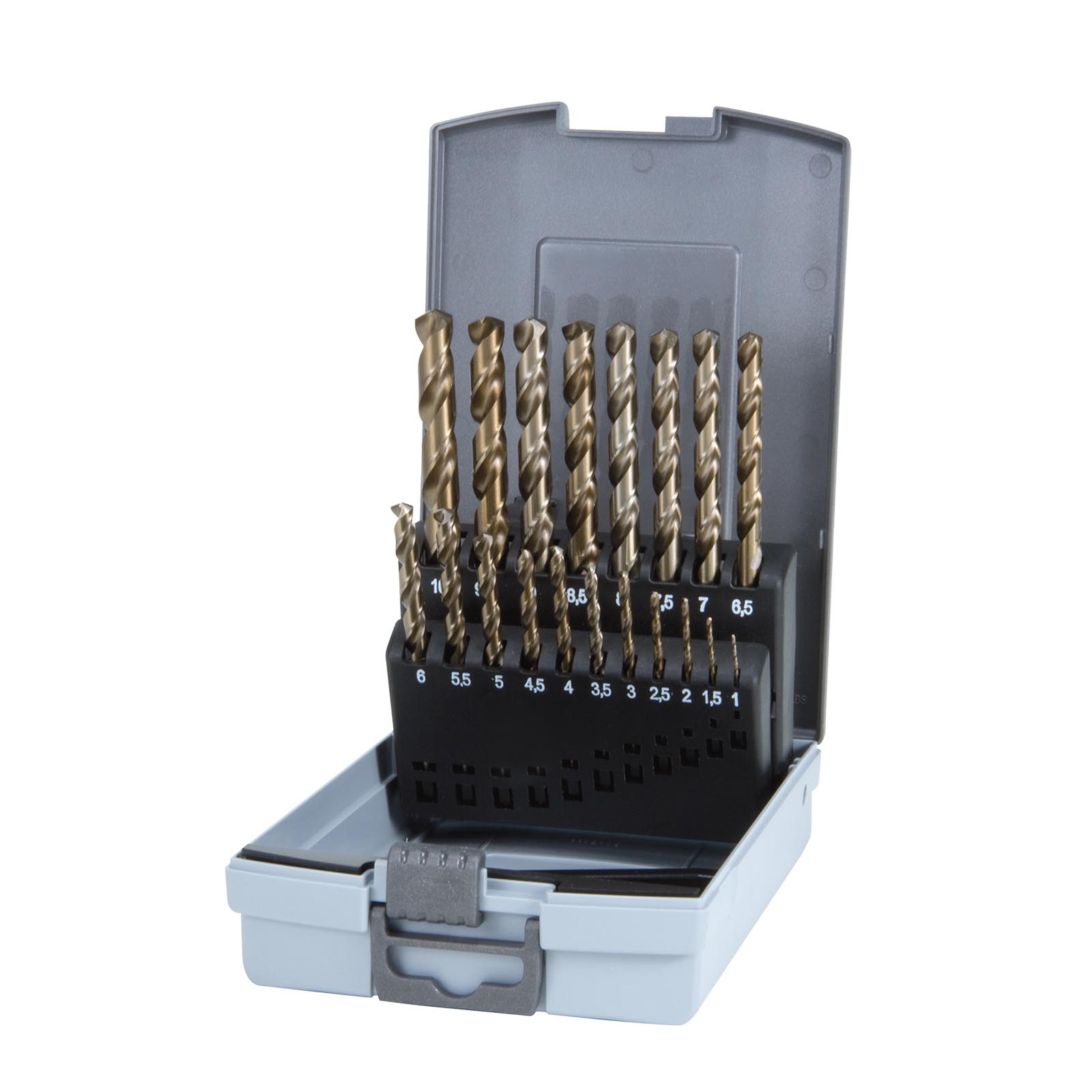 Sada 19 šroubovitých vrtáků DIN 338 typu N. 1-10 mm v řadě po 0,5 mm. Vrtáky jsou uloženy v plastovém boxu.