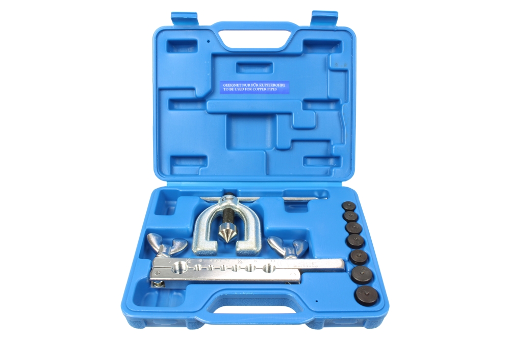 Pertlingová súprava na výrobu bežných 90° koncoviek, otvorených F-koncoviek a dvojitých E-koncoviek* pre medené a hliníkové rúry s maximálnou hrúbkou steny 1 mm*súprava obsahuje: 1 ks lisovacia svorka, 1 ks upínacia čeľusť na rúry, 7 ks lisovacích adaptérov pre priemery 1/4" - 1/2" - 4,75 - 5 - 6 - 8 - 10 mm*dodávané v PVC kazete