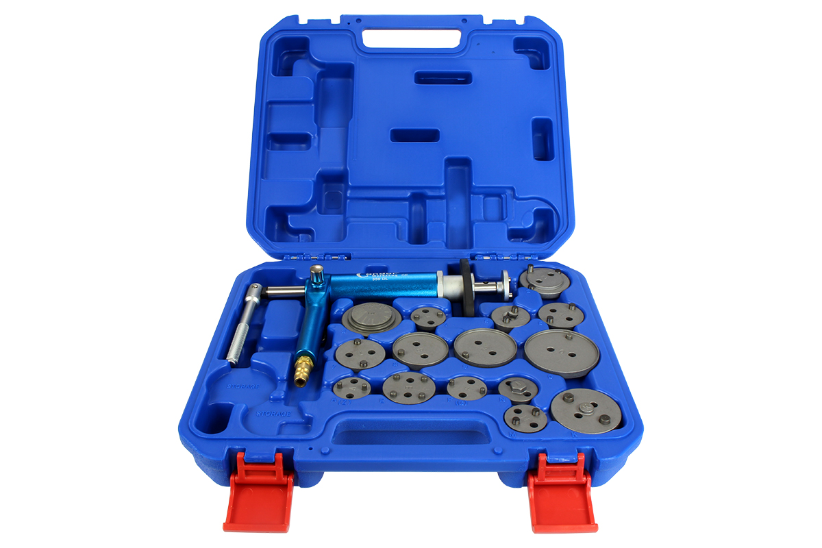 univerzálna pneumatická súprava pre osobné a dodávkové vozidlá* pre brzdové piesty na otáčanie a tlačenie*rozsah dodávky: 1 ks pneumatické vreteno*1 ks adaptér pre tlačné tiahla*14 ks adaptérov pre zatáčacie piesty s priemermi/čapmi: 30/2 - 32/1 - 32/2 (3 ks) - 36/2 - 42/2 (2 ks) - 42/4 - 48/1 - 51/3 - 54/1 - 54/3 - 63,6/1*pre tlak vzduchu 5 - 8 barov