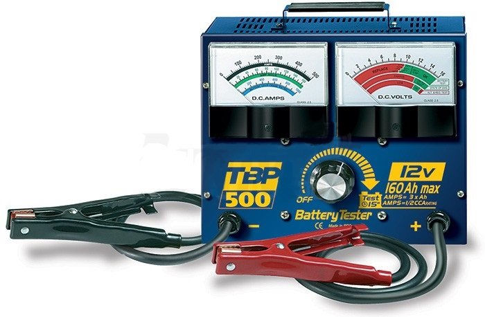 testovací napětí 12,0 V, max.zatěžovací proud 0-500 A, rozměry 105x60x255 mm, hmotnost 3,5 kg, zkušební kabely 1 m.