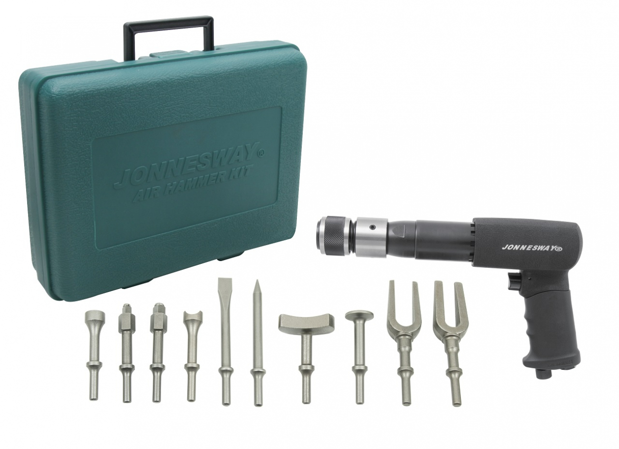 Kladivo na vzduchový (pneumatický) pohon, univerzální, sada 10 pracovních nástavců, v plastovém kufru – JONNESWAY JAH-310K
