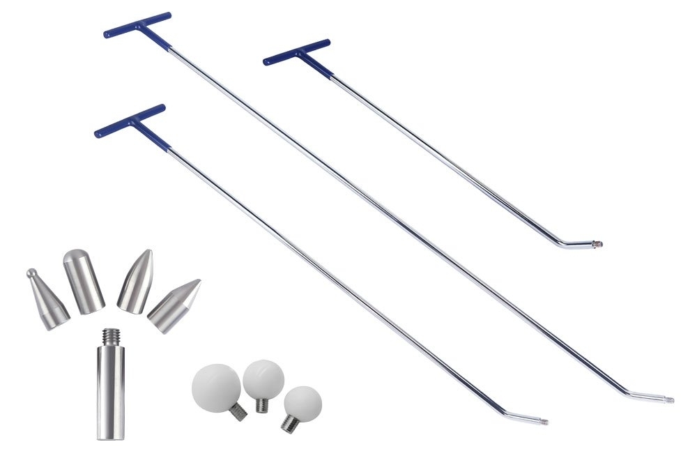 Sada 3 špeciálnych nástrojov na odstraňovanie preliačin a preliačenín z karosérií vytláčaním pomocou technológie PDR bez poškodenia laku obsahuje 3 rôzne háky a 7 skrutkovacích nástavcov.