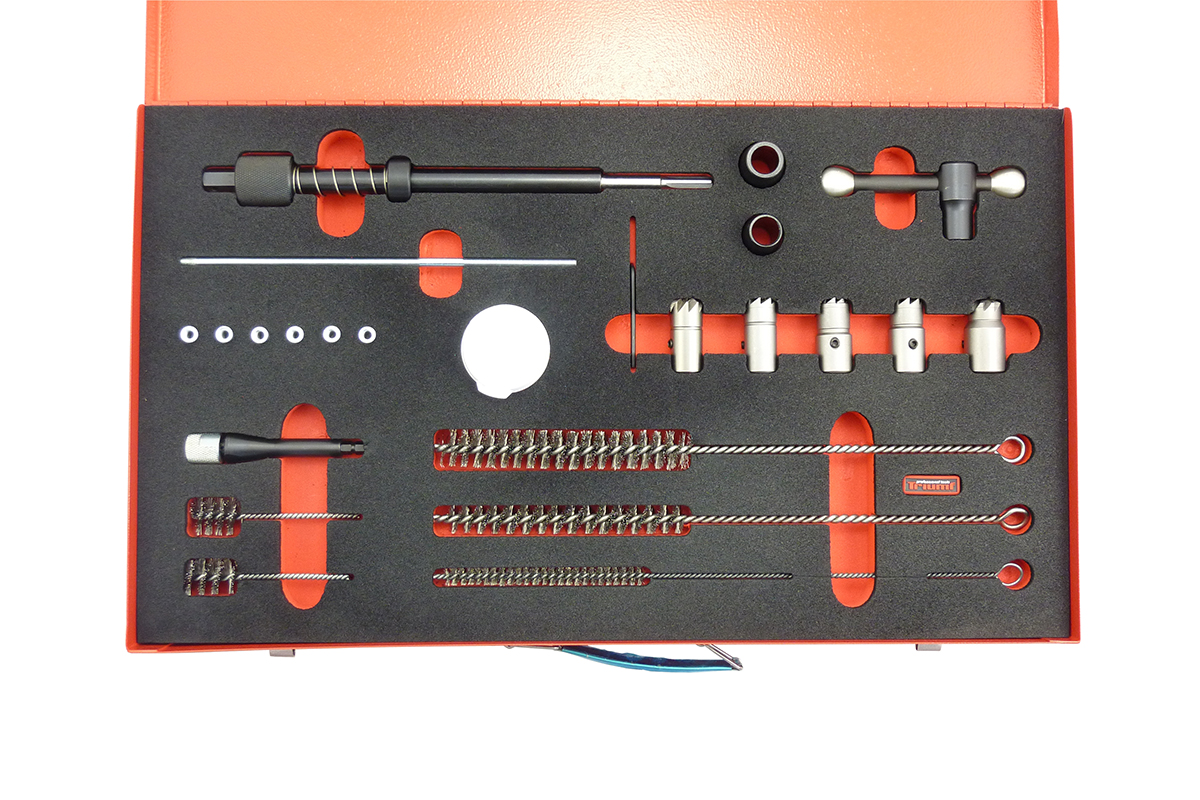 Sada je určena na úpravu sedel vstřikovačů *obsahuje frézy rovné 17 x17 mm - 17 x 19 mm - 15 x 19 mm, kónusové 120° 17 x 17 mm - 17 x 21 mm *držák fréz délka 260 mm s šestihrannem 12 mm *záslepky 6 ks *2 ks vystřeďovacích kónusů na držák fréz pro přesné nastavení *ruční kartáče 3 ks s délkou 300 mm a průměry 9 - 15 - 20 mm *2 ks kartáčů s unašečem do vrtačky s průměry 18 a 19 mm *pasta na montáž vstřikovačů 50 ml *klíč "L" inbus 2,5 mm *klíč "T" 12 mm