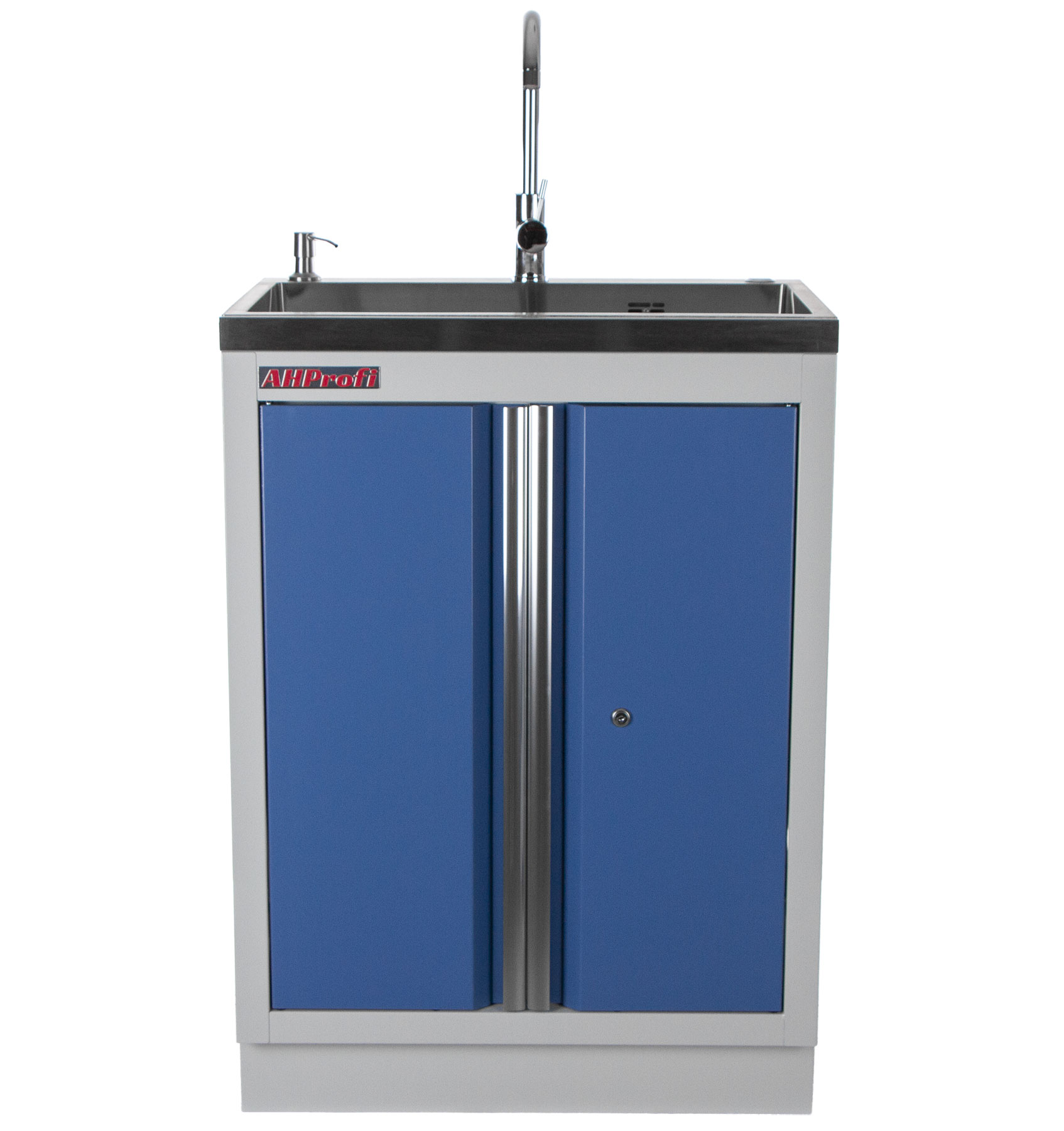 Celokovová PROFI BLUE dílenská dvoukřídlá skříňka s vestavěným nerezovým dřezem a baterií.