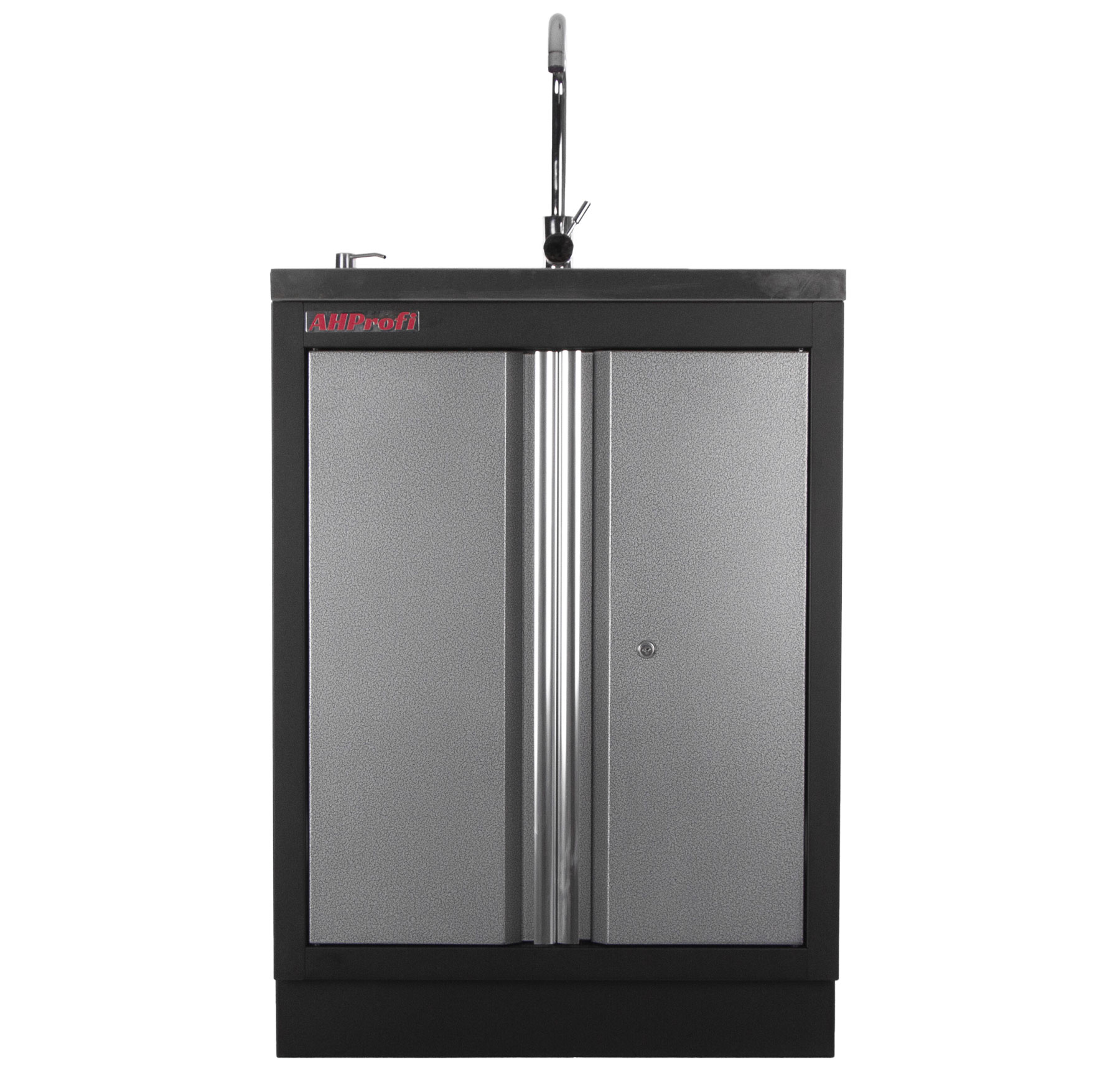 Celokovová PROFI dílenská dvoukřídlá skříňka s vestavěným nerezovým dřezem a baterií.