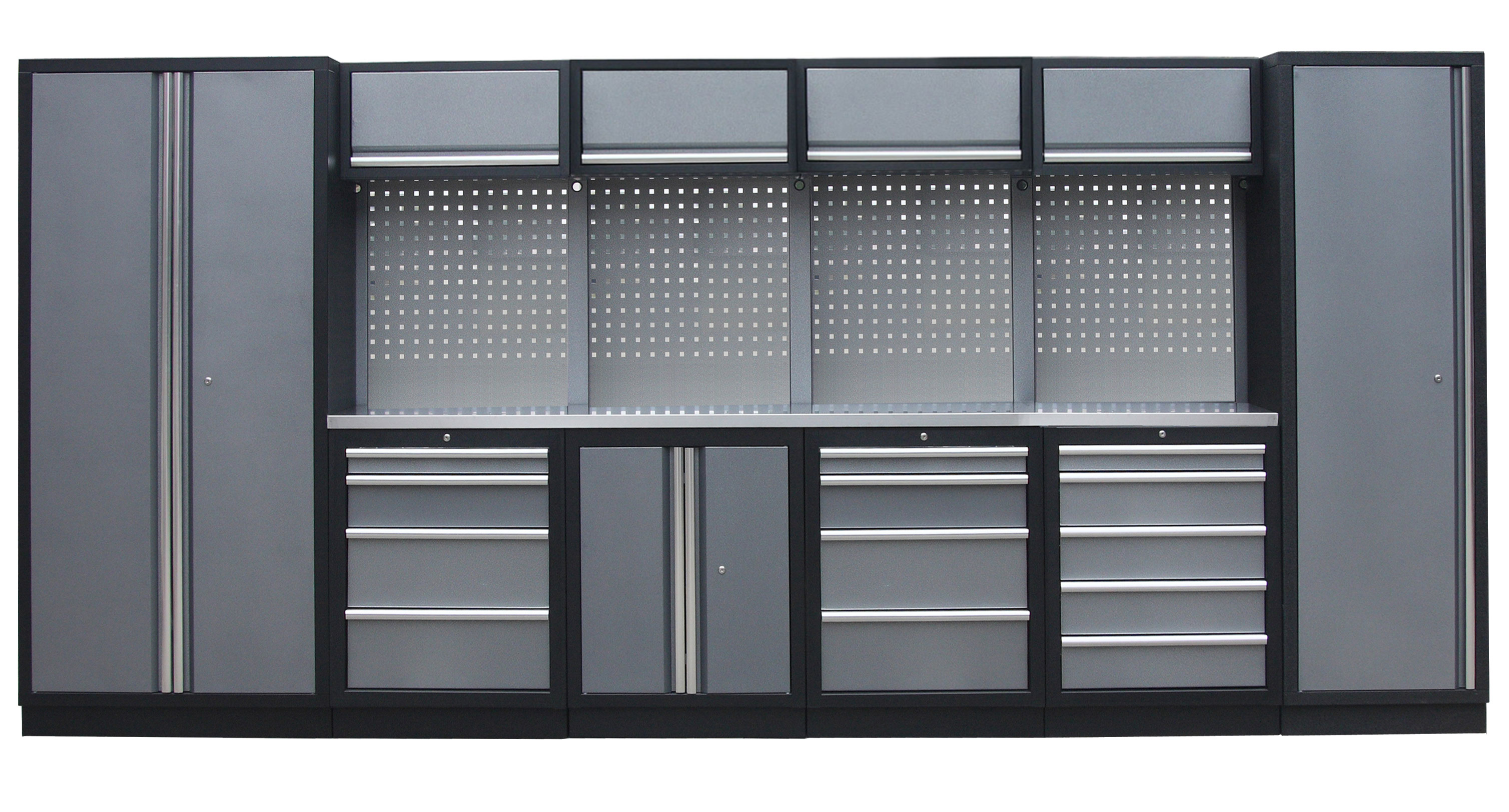 Dílenský nábytek PROFI GREY s nerezovou deskou zaujme moderním a profesionálním vzhledem. Kombinace kladívkové šedé a černé RAL 9004 barvy se bude vyjímat v každé garáži i dílně.