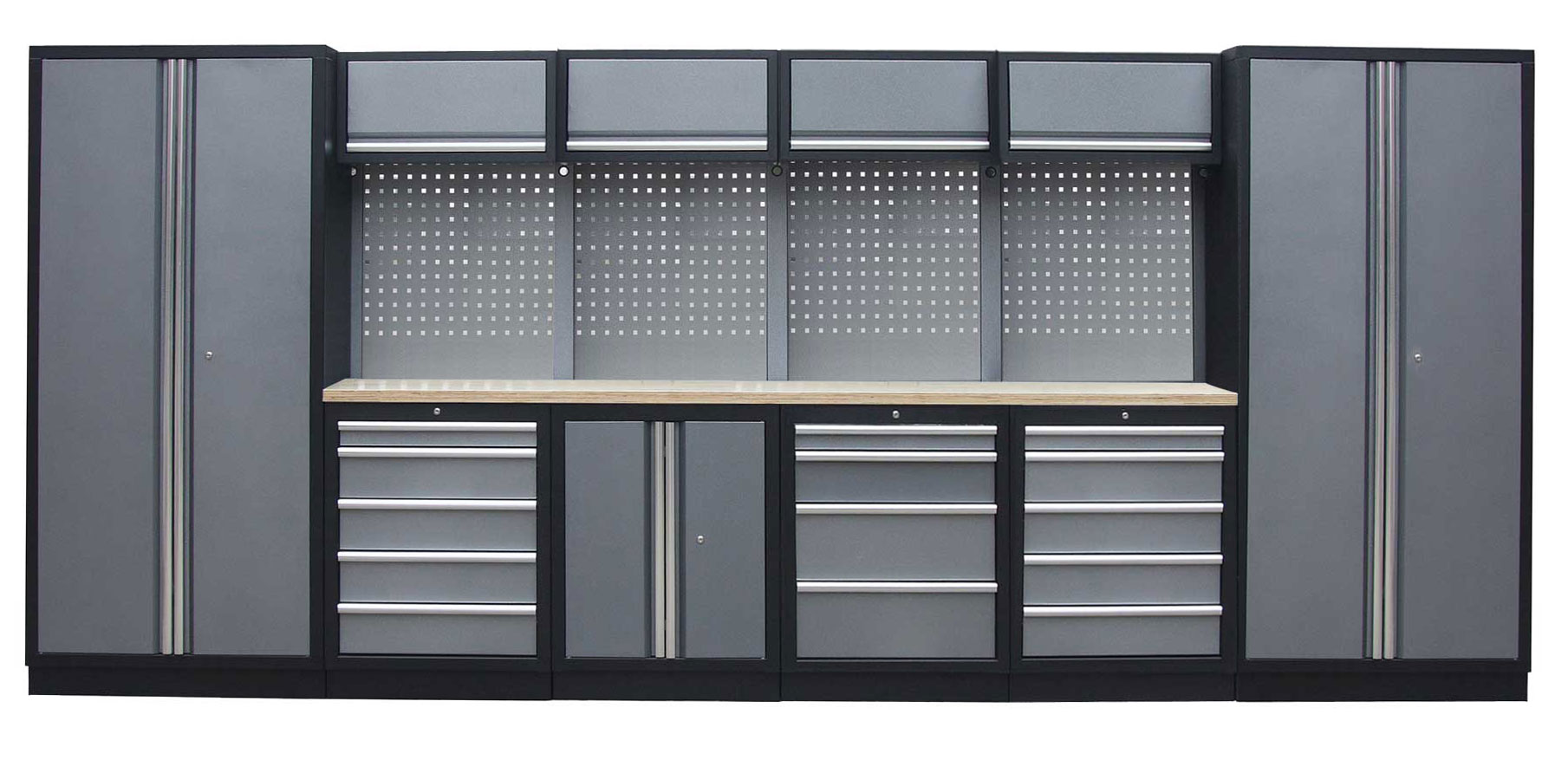 Dílenský nábytek PROFI GREY s dřevěnou deskou zaujme moderním a profesionálním vzhledem. Kombinace kladívkové šedé a černé RAL 9004 se bude vyjímat v každé garáži i dílně.