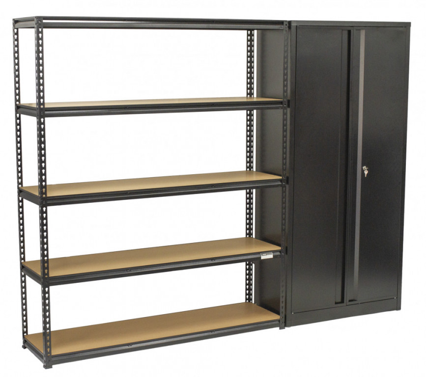 Regálový systém obsahuje klasický rovný regál o šířce 1500 mm a uzamykatelnou dílenskou skříň o šířce 860 mm.