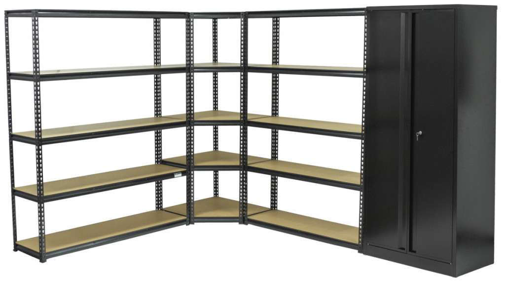 Rohová sada policových regálů s dílenskou skříní najde široké využití například v domácnosti, technické místnosti, dílně nebo garáži, ale také ve skladech nebo obchodech.