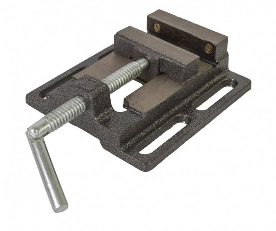 Litinový strojní svěrák, určený k montáži na pracovní stoly nebo pod stojanové vrtačky.