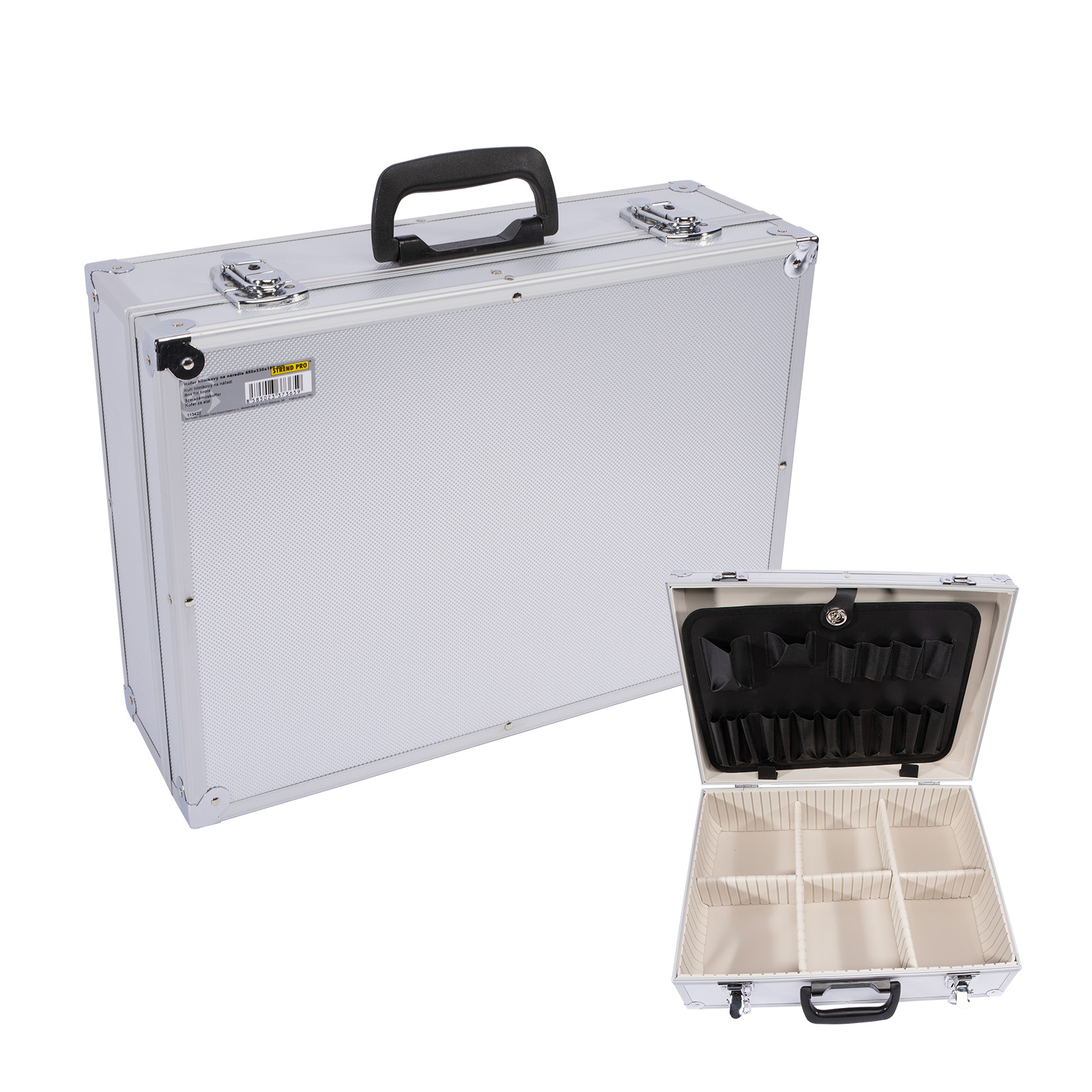 Hliníkový kufr na nářadí má nastavitelné vnitřní přihrádky, které umožňují libovolně přestavět na oddíly.