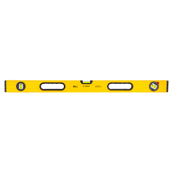 Hliníková vodováha, 80 cm, 3 libely, (VxŠ) 53 x 24 mm, nastavitelná libela, broušená měřicí plocha, přesnost měření 0,5 mm/m Hliníková vodováha typu 600 TOPEX s přesností měření +/- 0,5 mm/m. Opatřena 3 libelami, včetně jedné nastavitelné, usnadňující měření. Vyrobena z odolné hliníkové slitiny. Měřící plocha dodatečně frézována. Profilované rukojeti zvyšují komfort a bezpečnost při práci. Značka TOPEX je určena pro domácí kutily.