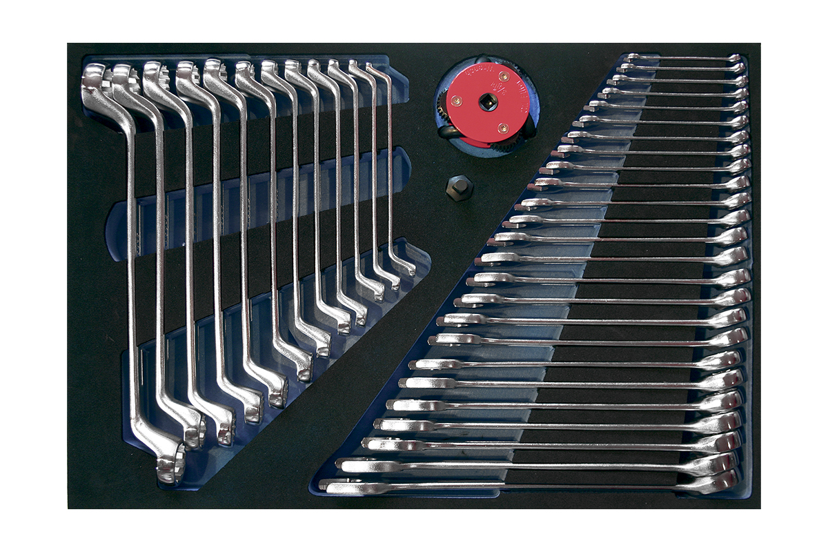 modul 38 dílů* klíč očkoplochý - 6, 7, 8, 9, 10, 11, 12, 13, 14, 15,16, 17, 18, 19, 20, 21, 22, 23, 24, 25, 26, 27, 28, 30, 32 mm* klíč očkoplochý vyhnutý - 6x7, 8x9, 10x11, 12x13, 14x15, 16x17, 18x19, 20x22, 21x23, 24x26,25x28, 27x32 mm* klíč na olejové filtry, tříramenný - 70-120 mm * rozměr šxhxv - 585 x 405 x 50 mm