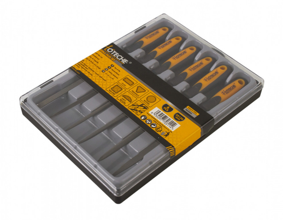 Balení obsahuje pilníky: plochý, plochý se špičkou, trojhranný, kulatý, čtvercový a půlkulatý.