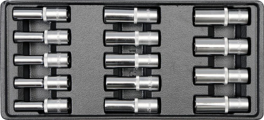 Sada 14 kusov hlbokých nástrčných kľúčov z CrV ocele. Sada kľúčov je prehľadne zoradená v PVC vložke na nástrčné kľúče.