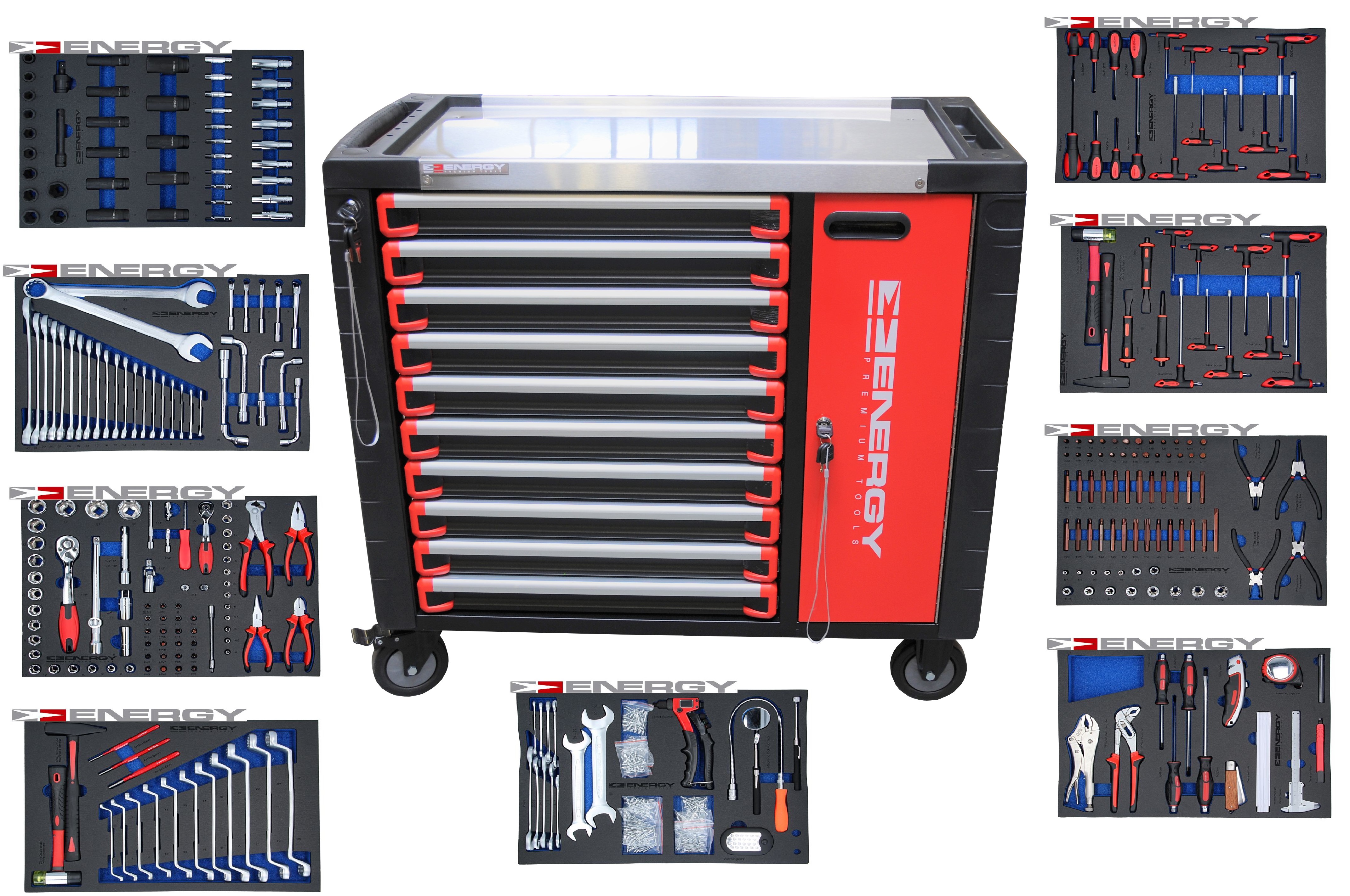 NÁŘADOVÝ VOZÍK Premium 305 prvků + 300 montážních prvků (nýtů). 9 zásuvek na vodicích kuličkových lištách s jednotlivými blokádami a centrální zásuvkou na klíček. Boční zásuvka s dvěma poličkami zamykaná na klíč. Dvě otočná kola, brzda. Kovová vrchní deska. Rozměry 46x97x92cm. Hmotnost 107 kg . Tento diel je možné odobrať len osobným odberom.