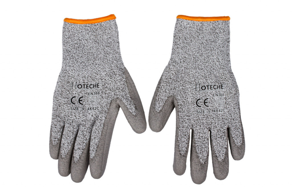 Protipořezové ochranné rukavice značky Hoteche v šedé barvě ve velikosti 9/L. Rukavice se nehodí do pračky, sušičky, ani na žehlení.
