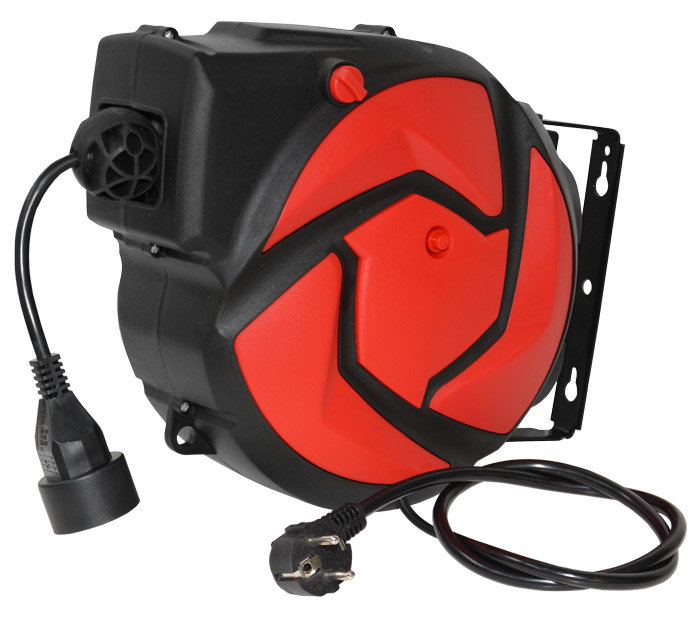 Profesionální automatický naviják s upevněním na stěnu, strop nebo jinou konstrukci je vybavený el. kabelem dl. 14 m, 1 zásuvkou 230 V a novým systémem aretace i navíjení.