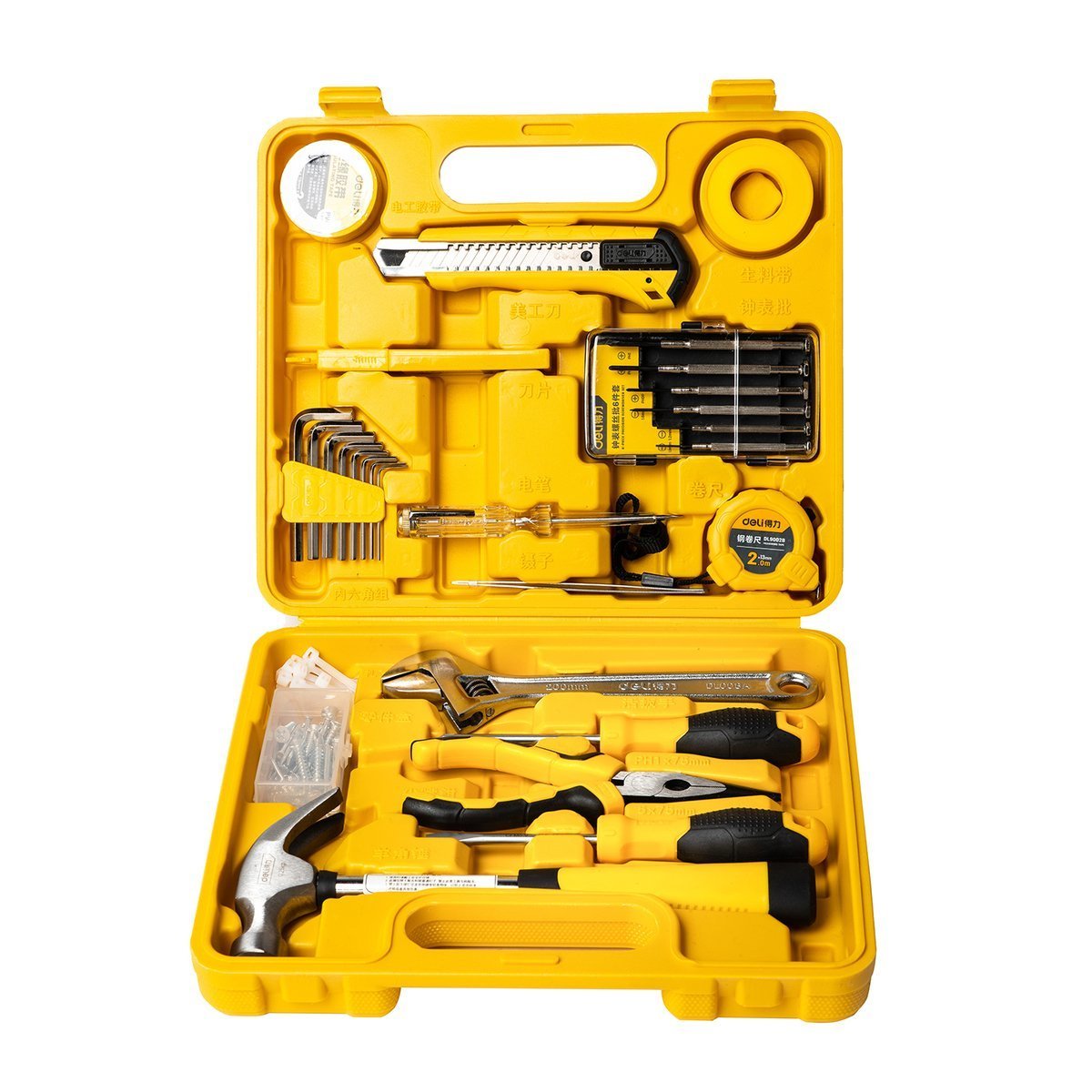 Sada Deli obsahuje 28 nástrojů, které jistě využijete. Ať už montujete skříňku, kuchyňské doplňky nebo lampu, sada EDL1028J se vám v těchto a podobných situacích bude hodit. Všechny prvky sady jsou umístěny v praktickém kufříku, díky kterému bude jejich skladování jednoduché a pohodlné. Sada obsahuje: nůž s nastavitelnou délkou čepele, 10 náhradních čepelí, 3 m dlouhou izolační pásku odolnou proti vodě a ohni, 2 m dlouhý svinovací metr, 2 šroubováky s protiskluzovou rukojetí, kleště z nerezové oceli, kladivo z uhlíkové oceli, nastavitelný klíč (8") s chromovanou povrchovou úpravou, teflonovou pásku odolnou proti ohni, nylonovou vázací pásku, sadu 6 poniklovaných šestihranných klíčů, pinzetu z nerezové oceli a zkoušečku napětí odolnou proti korozi pro zásuvky 100-500 V.