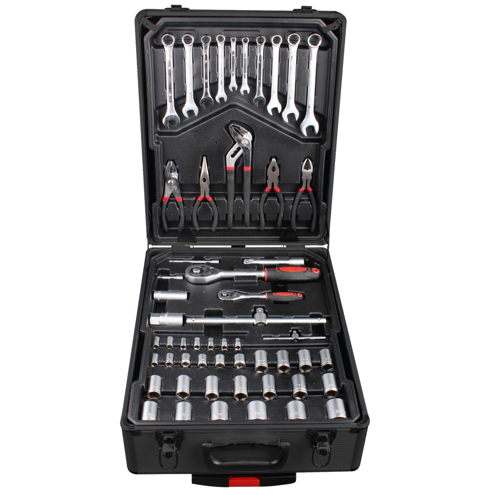 Sada 188 dílů nářadí v hliníkovém kufru na kolečkách. Nářadí uloženo na plastových platech s prolisy pro každý kus zvlášť, což zabraňuje smíchání a vysypání nářadí při převozu. Nezbytný pomocník každého kutila a montéra, ideální pro převoz v autě.