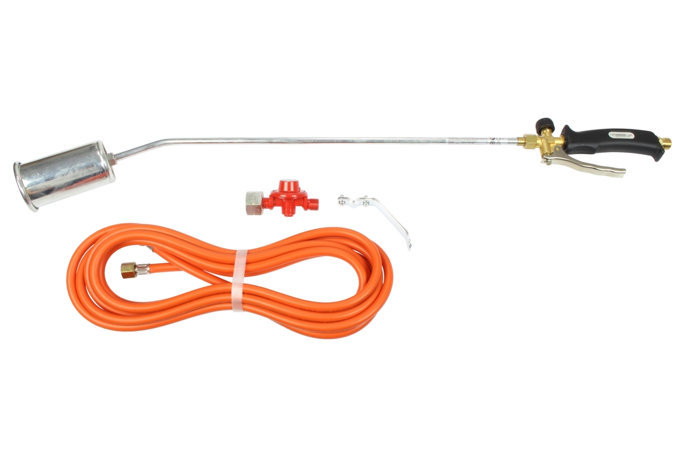 Vysoko výkonný horák na ohrievanie, opálenie, zváranie fólií, asfaltovanie, izoláciu striech, sušenie betónu, ako aj na biologickú reguláciu buriny a odstraňovanie machu *tento prístroj sa môže používať len s propánom, alebo so zmesou propánu a butánu pri použití vhodného regulátora konštantnej teploty *teplota plameňa do 1060 °C *kategória prístroja I3(B/P) *tlak plynu max. 4 bar 8 kg/h *priemer dýzy plameňa na údržbu 0,4 mm *priemer dýzy plameňa na prácu 1,7 mm *priemer horáka 60 mm *dĺžka tela horáka 60 cm *dĺžka hadice 5 m
