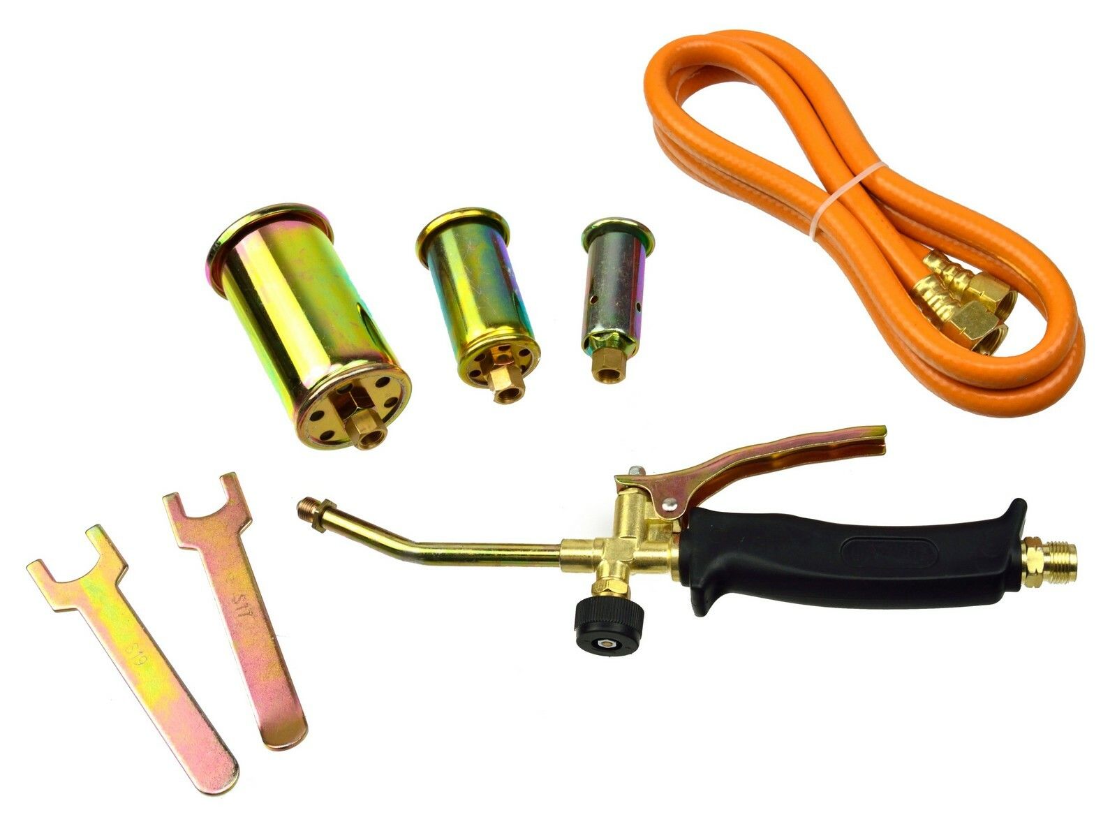 Profesionální plynový hořák pro ohřev a spalování v sadě se 3 tryskami.