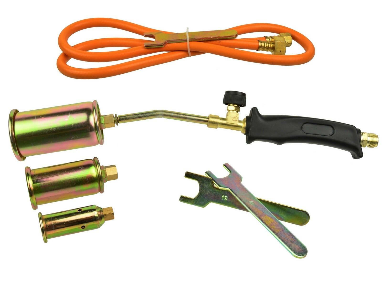 Profesionální plynový hořák pro ohřev a spalování v sadě se 3 tryskami.