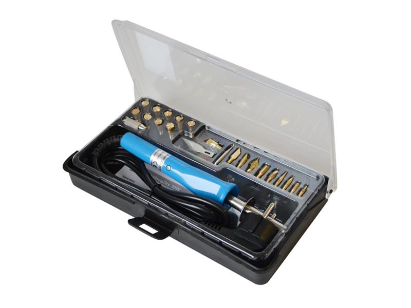 Pájecí / vypalovací pero ZD-972A 30W je vhodná např. pro vypalování do měkkého dřeva a jiných materiálů k vytváření různých dekorací. Součástí sady je pájecí hrot a navíc sada dalších 21 hrotů různých tvarů. Vše je zabaleno v praktickém plastovém kufříku jako set na pyrografiku. Součástí je i stojánek na odkládaní horkého hrotu pájky.