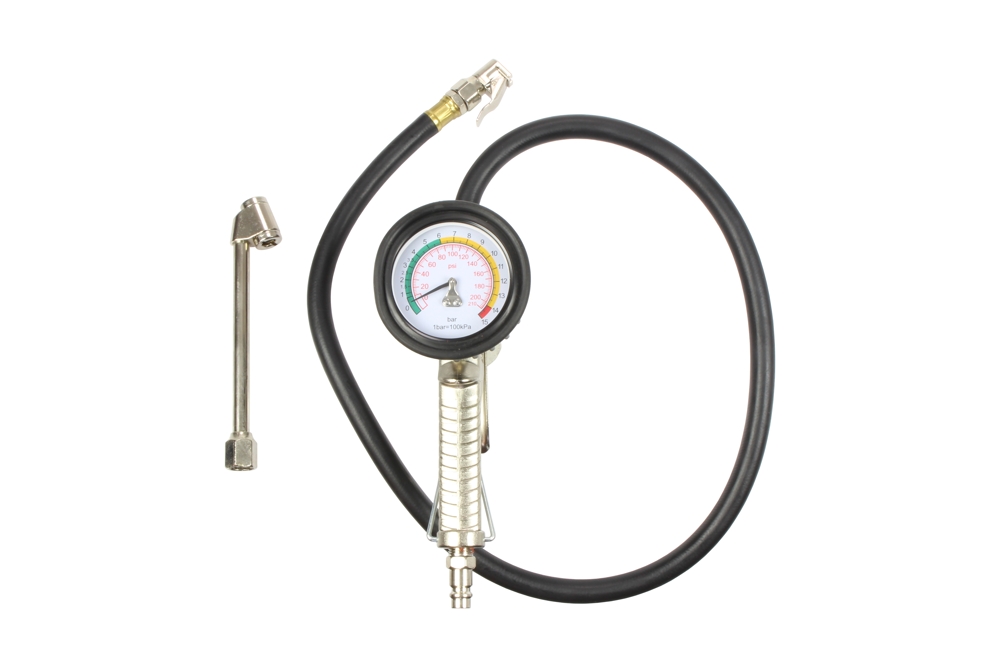 Profesionálna nafukovačka pneumatík s kovovým telom *Rozsah merania 1 - 14 bar *Dĺžka hadice 86 cm *Priemer manometra 60 mm *Pevný nástavec na nafukovanie dvojmontáží
