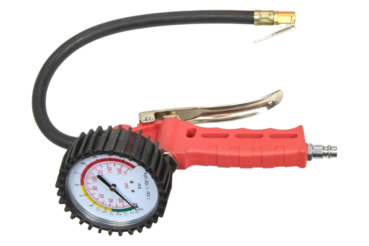 Hustilka pneumatík na plnenie pneumatík *rozsah merania 0 - 12 barov *hadica 500 mm *telo z tvrdeného plastu s manometrom chráneným gumou s priemerom 80 mm