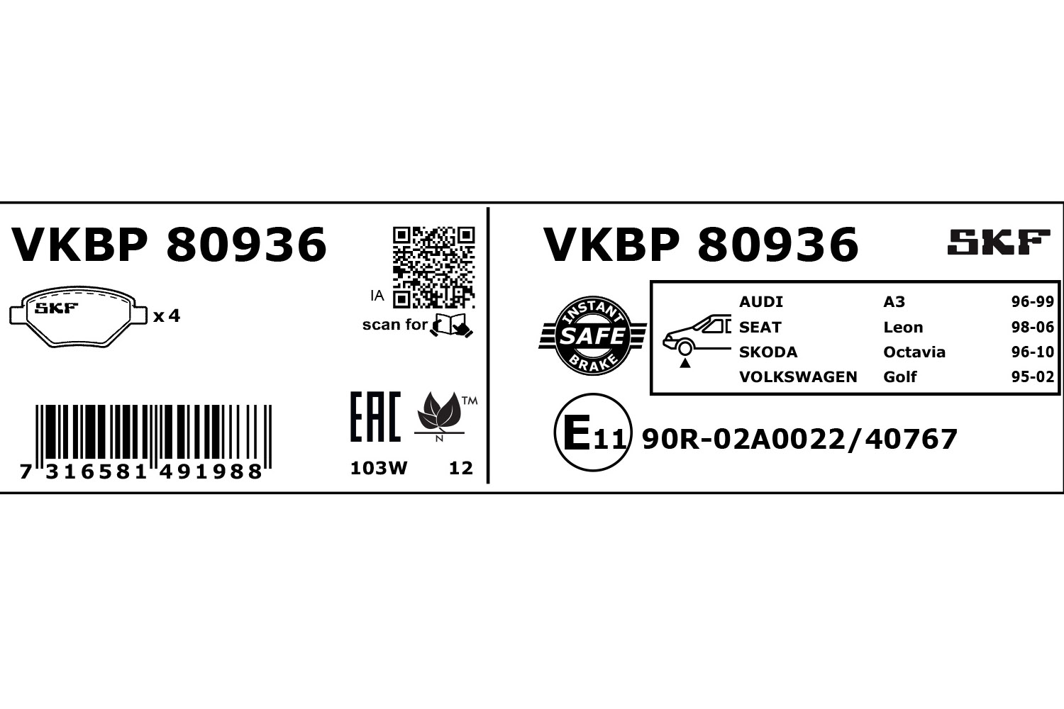 SKF VKBP 80936 - Sada brzdových platničiek, vždy 4 kusy v sade