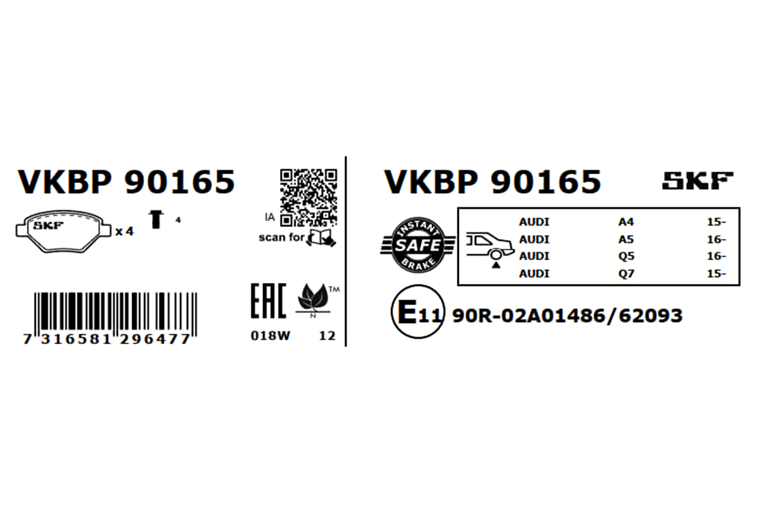 SKF VKBP 90165 - Sada brzdových platničiek, vždy 4 kusy v sade